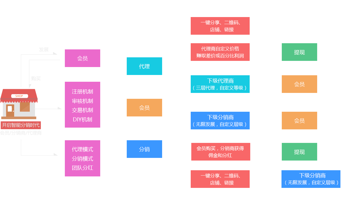 代理系统是由我司研发团队自主研发的一体化代理平台,发动代理商或朋友圈、移动端零售商发展三级以上代理商的全新系统,帮助企业打造多层级的营销模式,打破传统地域限制,不再按照固定佣金设置分成,下家可根据商家要求发展成上家代理,并快速复制其商业模式,结合多级裂变代理模式,吸引用户成为代理商为您销售商品,瞬间建立代理体系,抢占庞大线上市场。